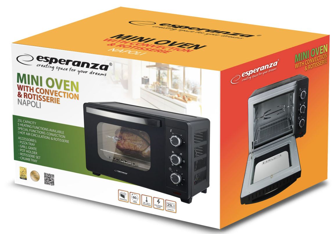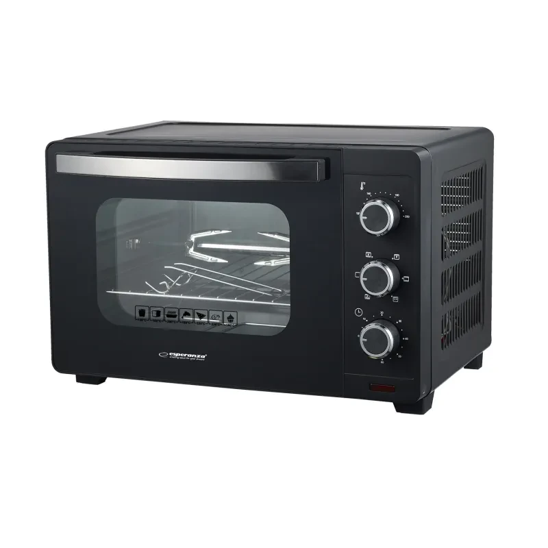 Esperanza EKO006N miniahi ühendab funktsionaalsuse kompaktse disainiga, pakkudes 5 küpsetusrežiimi, konvektsioonfunktsiooni ja pöördgrilli. 25-liitrise mahutavuse ja 1600 W võimsusega sobib see ideaalselt igapäevaste toitude valmistamiseks, aga ka pitsa, liha või köögiviljade küpsetamiseks. EKO006N mudel paistab silma kõrge energiatõhususega – seade saavutab soovitud temperatuuri kiiremini ja hoiab seda kauem, tarbides samal ajal vähem energiat. Kahekihiline klaasuks õhupiluga tagab parema soojusisolatsiooni ja suurendab kasutaja ohutust. Suurem maht ja suurem vahemaa väliskesta ja sisemise õõnsuse vahel tagavad rohkem küpsetusruumi ja parema soojuse hajumise, suurendades nii mugavust kui ka ohutust kasutamise ajal.