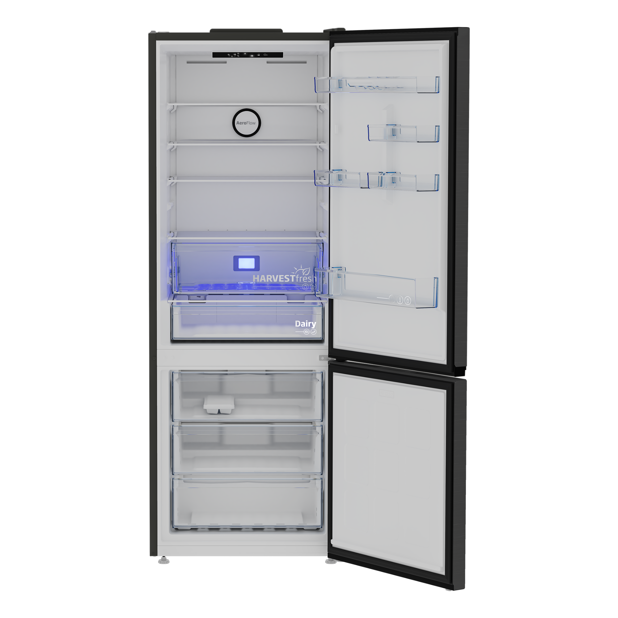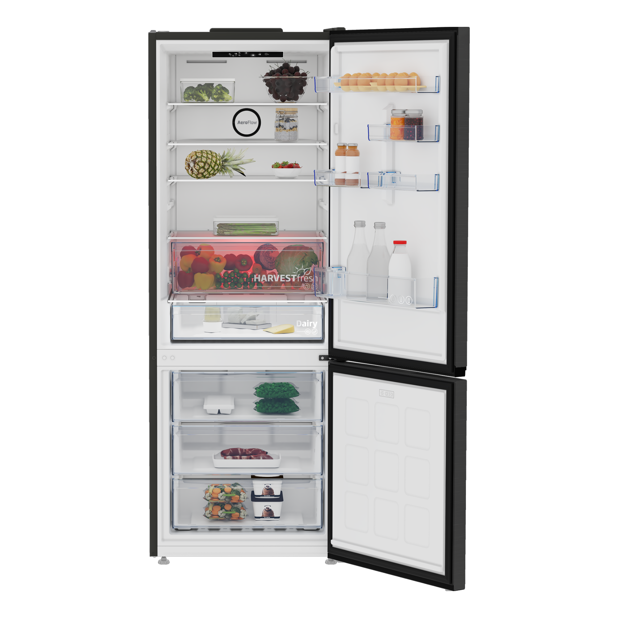 AeroFlow new generation two-part NoFrost cooling technology uses two separate cooling systems for the refrigerator and freezer sections. Ensuring the same cooling temperature for each shelf preserves the freshness, shape, vitamin C content, juiciness, lively and bright appearance of the food for a longer time.