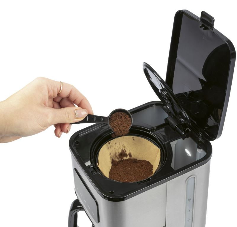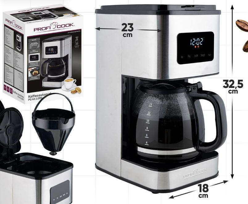 Stiilse disainiga, roostevabast terasest korpusega kohvimasin ProfiCook PCKA1299 12–14 tassi kohvi valmistamiseks (umbes 1,5 liitrit).