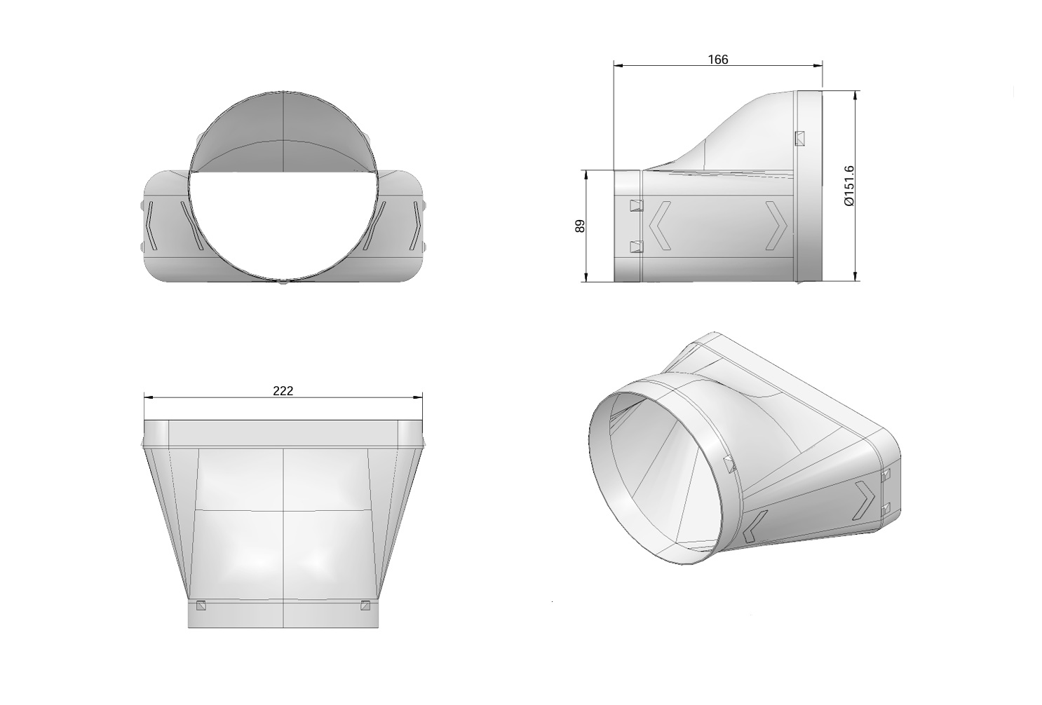 Ciarko Design ühendustoru üleminek 150 mm läbimõõduga ümmarguselt 222 x 89 mm lapiku disainiga väljalasketorule!