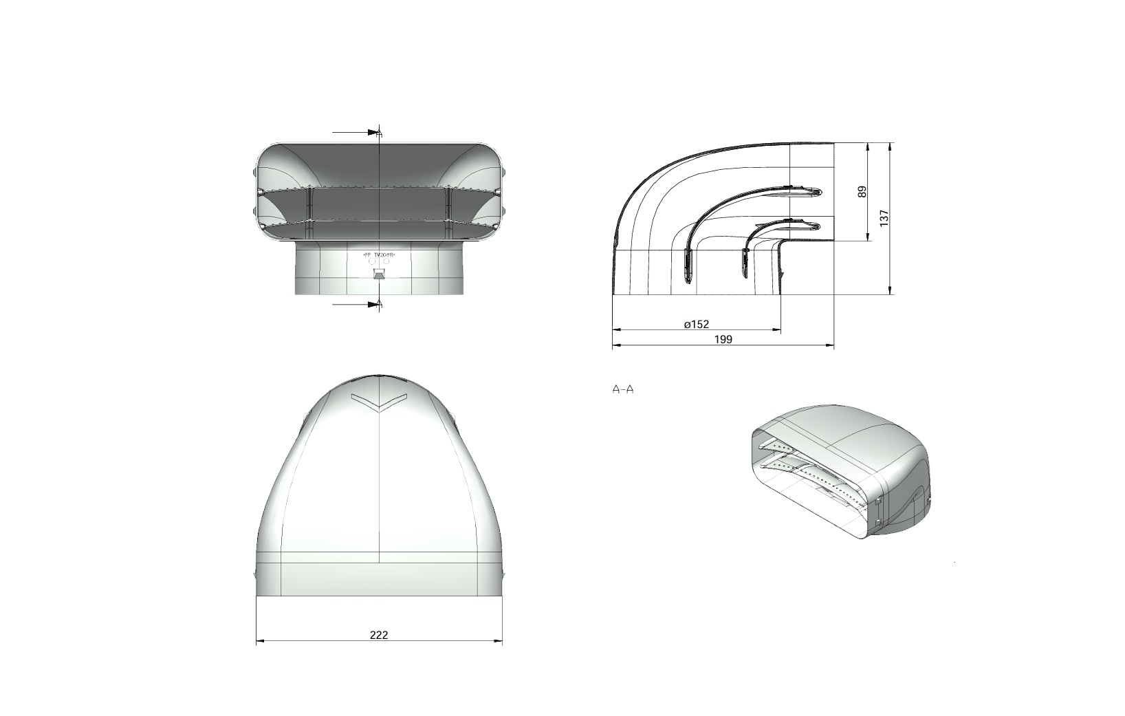Ciarko Design ühendustoru üleminek 150 mm läbimõõduga ümmarguselt 222 x 89 mm lapiku disainiga väljalasketorule 90° nurga all!