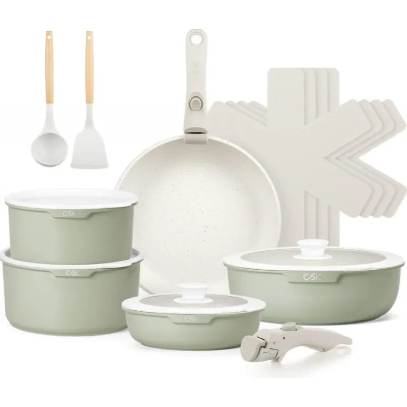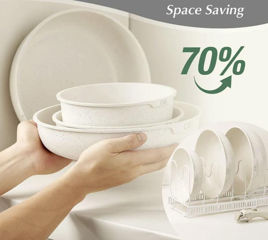 Экономия пространства - набор кухонной посуды KOCH SYSTEME CS с съемными ручками обеспечивает оптимальное хранение и простую укладку, экономя до 70% пространства по сравнению с обычными кастрюлями.